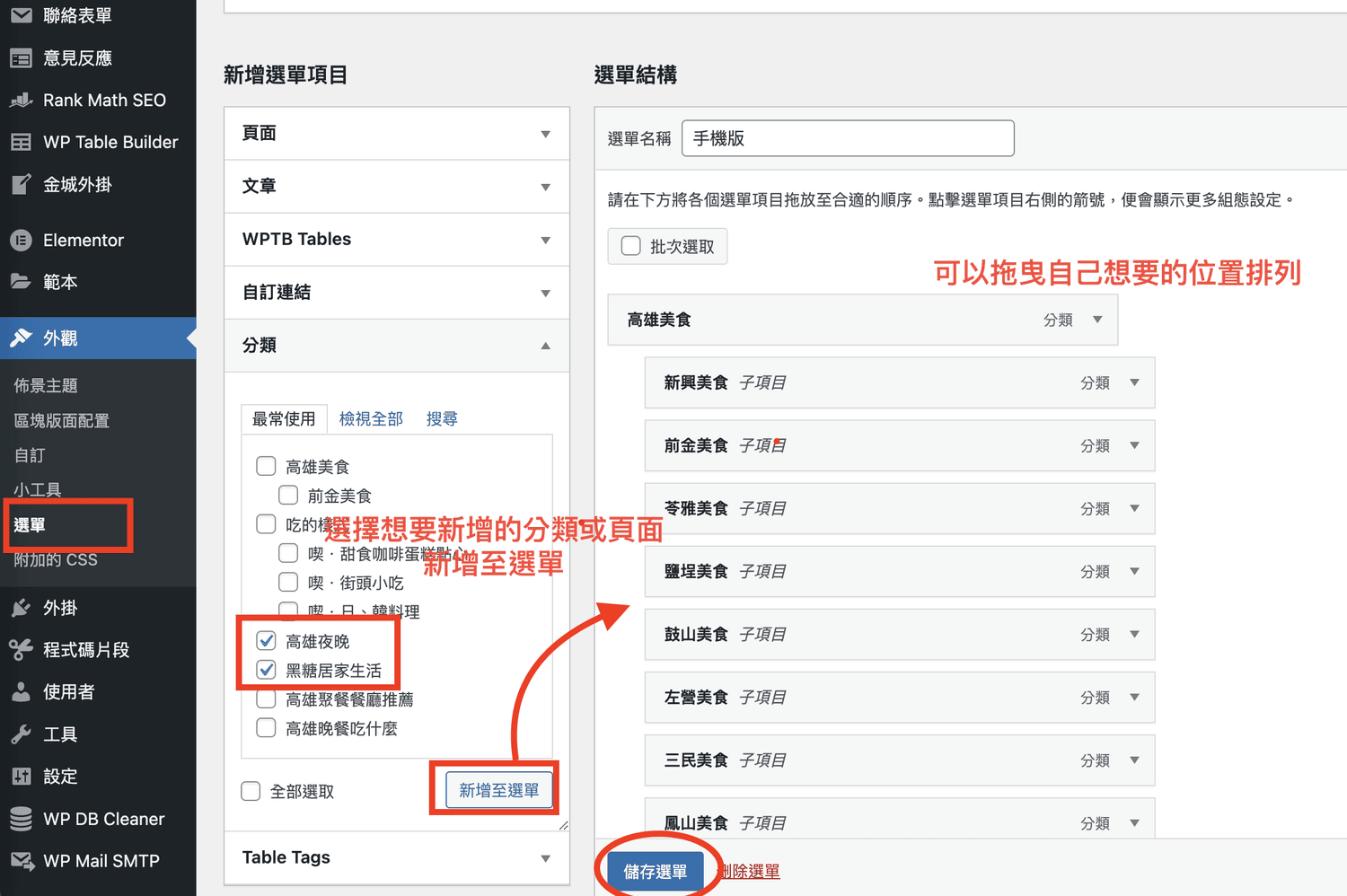 請先寫文章,文章當中有新增好分類(或是已經有的分類),最後才去選單新增想要出現的項目。