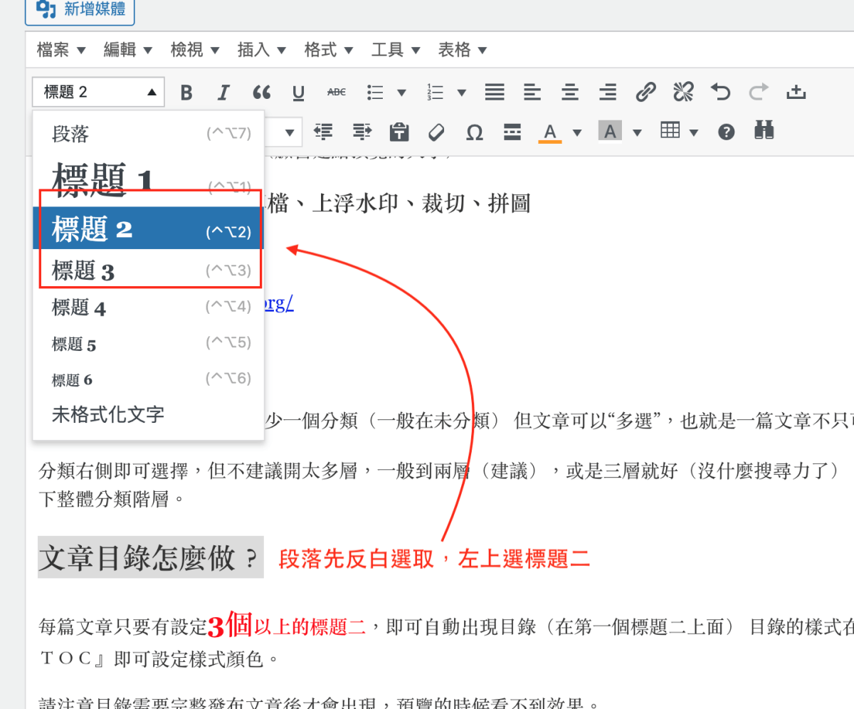 每篇文章只要有設定2個以上的標題二,即可自動出現目錄(在第一個標題二上面) 請注意目錄需要完整發布文章後才會出現,預覽的時候看不到效果。 優化目錄的樣式設定可以指定框線顏色,請敲客服提供您的個人喜好配色。