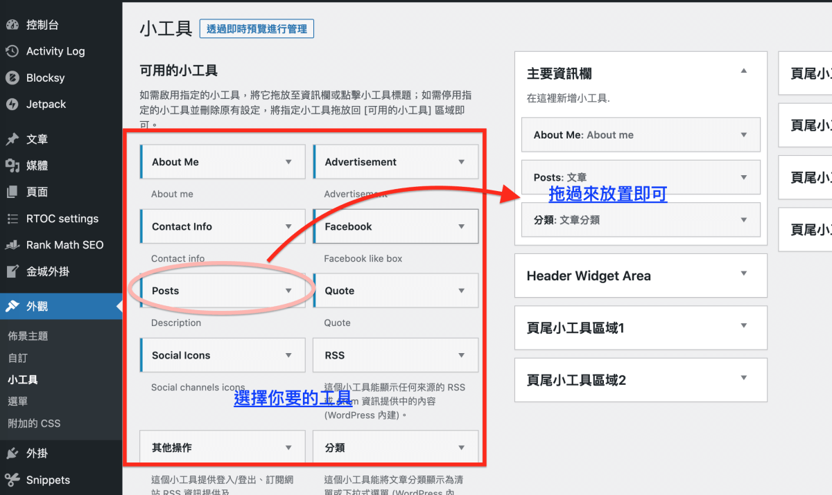 把左邊兩排工具,拖曳想要新增的東西,移動至『主要資訊欄』置放,並完成細部設定&儲存